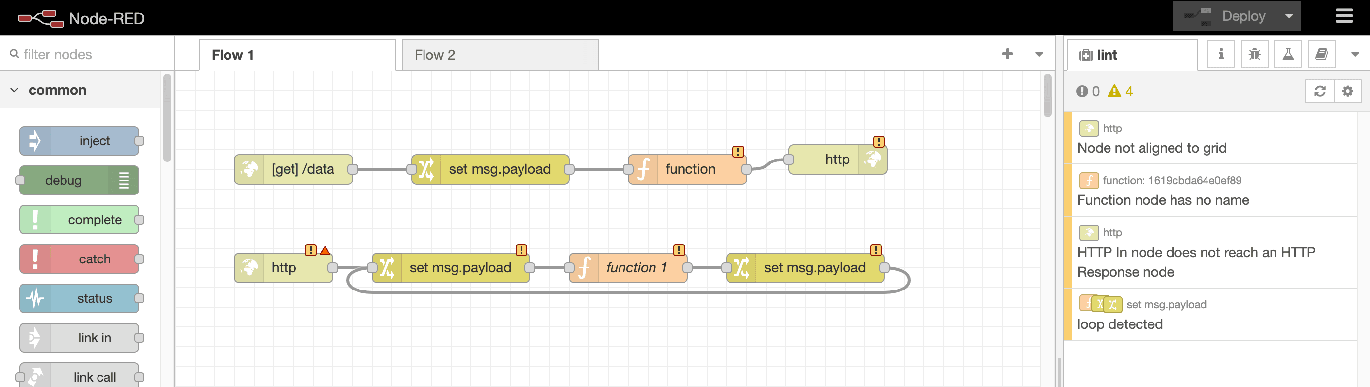 On the stylistic side, for example, it can highlight nodes that aren't properly aligned to the grid. Whilst this doesn't have any bearing on the runtime operation of the flow, it encourages keeping the flows tidy and orderly.